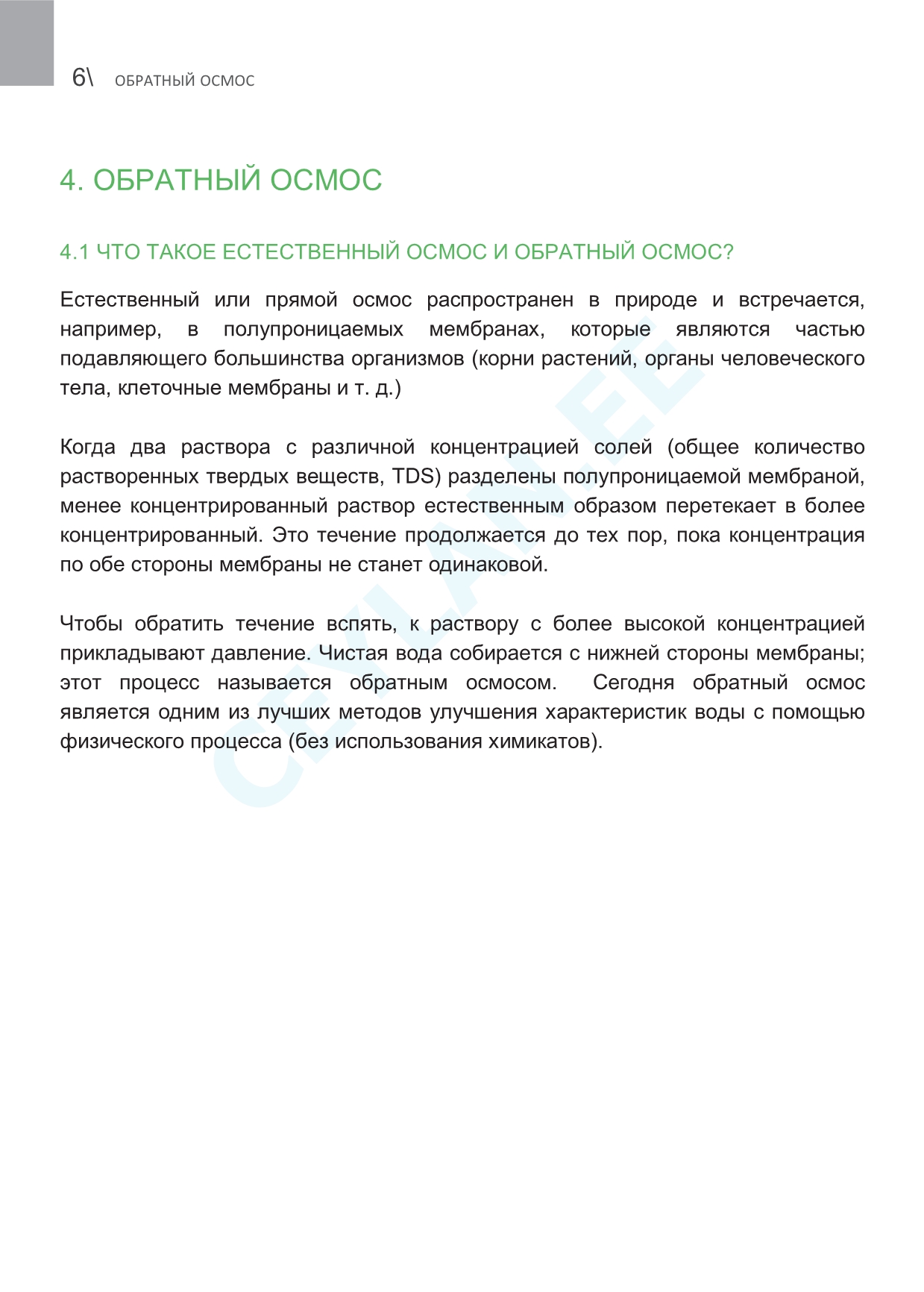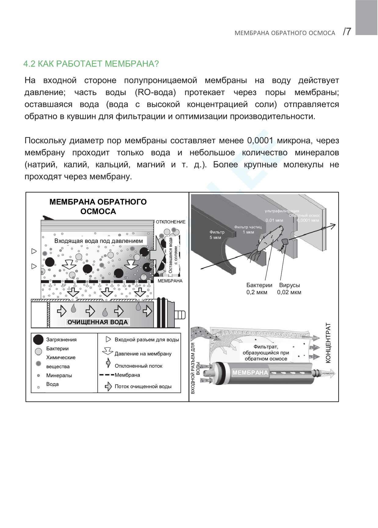 | 4-й этап Мембрана Greenfilter | Удаляет практически все органические загрязнения, а также растворенные в воде посторонние жидкости, бактерии, вирусы, соли тяжелых металлов, железо, марганец, мышьяк, ртуть и т.д. |